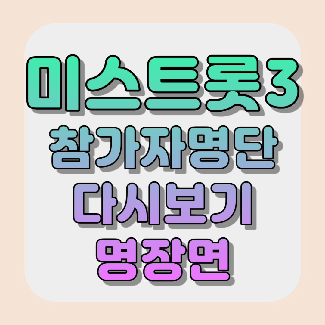 2023년 12월 미스트롯3이 시작되었습니다. 이번 출연자들은 반가운 얼굴들도 있고 실력이 출중한 사람들은 다 모아놓은 것처럼 하나같이 모두 잘하더라고요. 본방사수 못하시거나 다시 보고 싶은 분들을 위해 무료로 다시 볼 수 있는 방법과 참가자 소개 영상, 매 회차의 하이라이트 영상 보실 수 있도록 링크 올려두었습니다. 이번 미스트롯3도 화이팅입니다^^